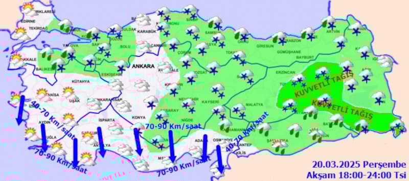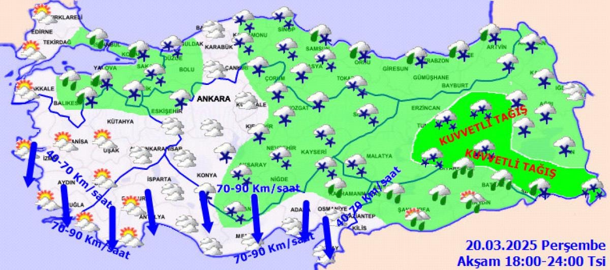 Parçalı ve çok bulutlu, Kütahya ile Afyonkarahisar çevrelerinin hafif kar yağışlı geçeceği tahmin ediliyor. Rüzgârın, güney Ege'de kuzey ve kuzeydoğu yönlerden kuvvetli ve yer yer kısa süreli fırtına (40-70 km/saat) şeklinde esmesi bekleniyor.