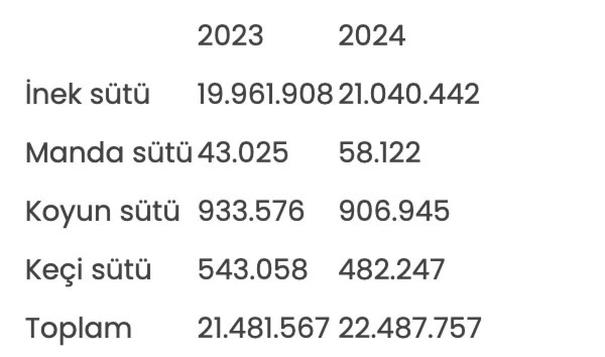 Türkiye'de 2023 ve 2024 yıllarında üretilen çiğ süt üretimleri (ton) şöyle: