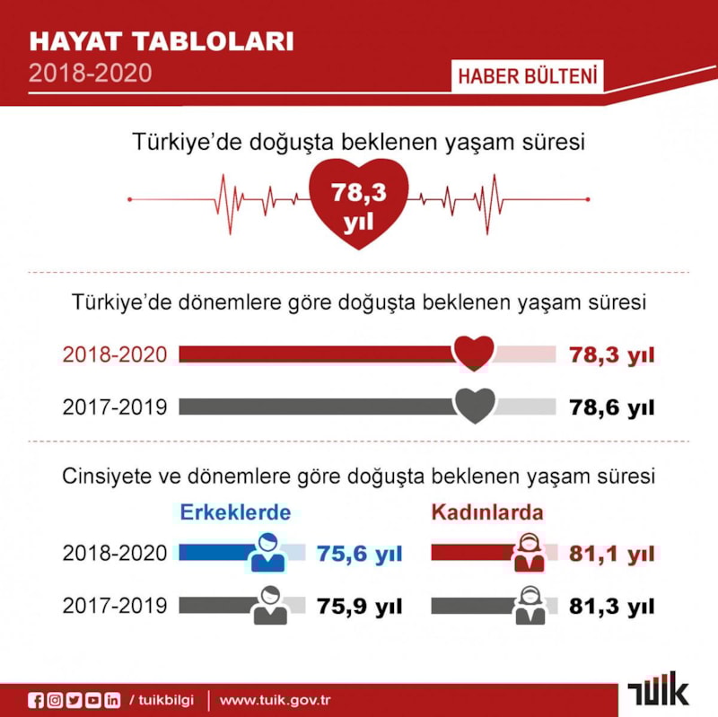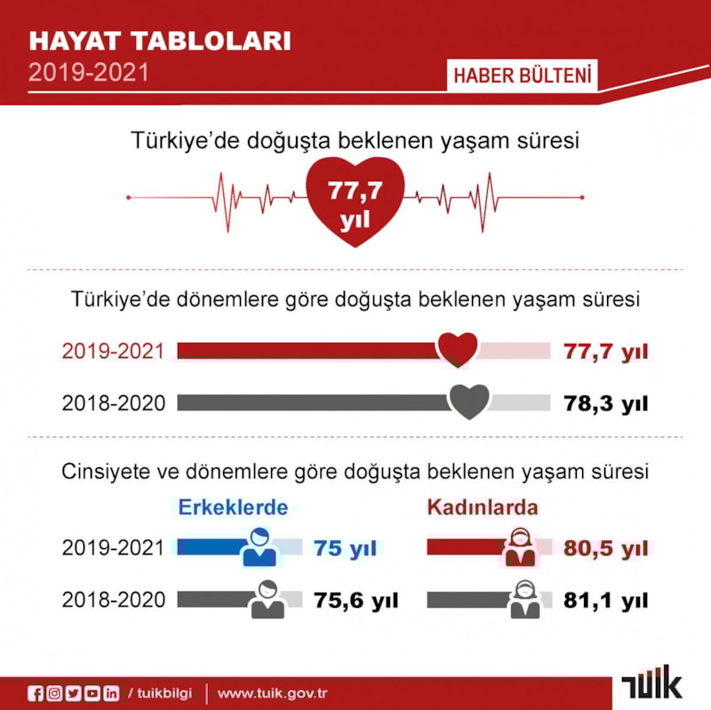TÜİK, Türkiye'de doğuşta beklenen yaşam süresinin 2018-2020 yıllarında 78,3 yıl, 2019-2021 döneminde ise 77,7 yıl olduğunu açıkladı. Erkeklerde doğuşta beklenen yaşam süresi 75 yıla, kadınlarda 80,5 yıla indi. Kadınların erkeklerden 5,5 yıl daha uzun yaşadığı öngörüldü.
