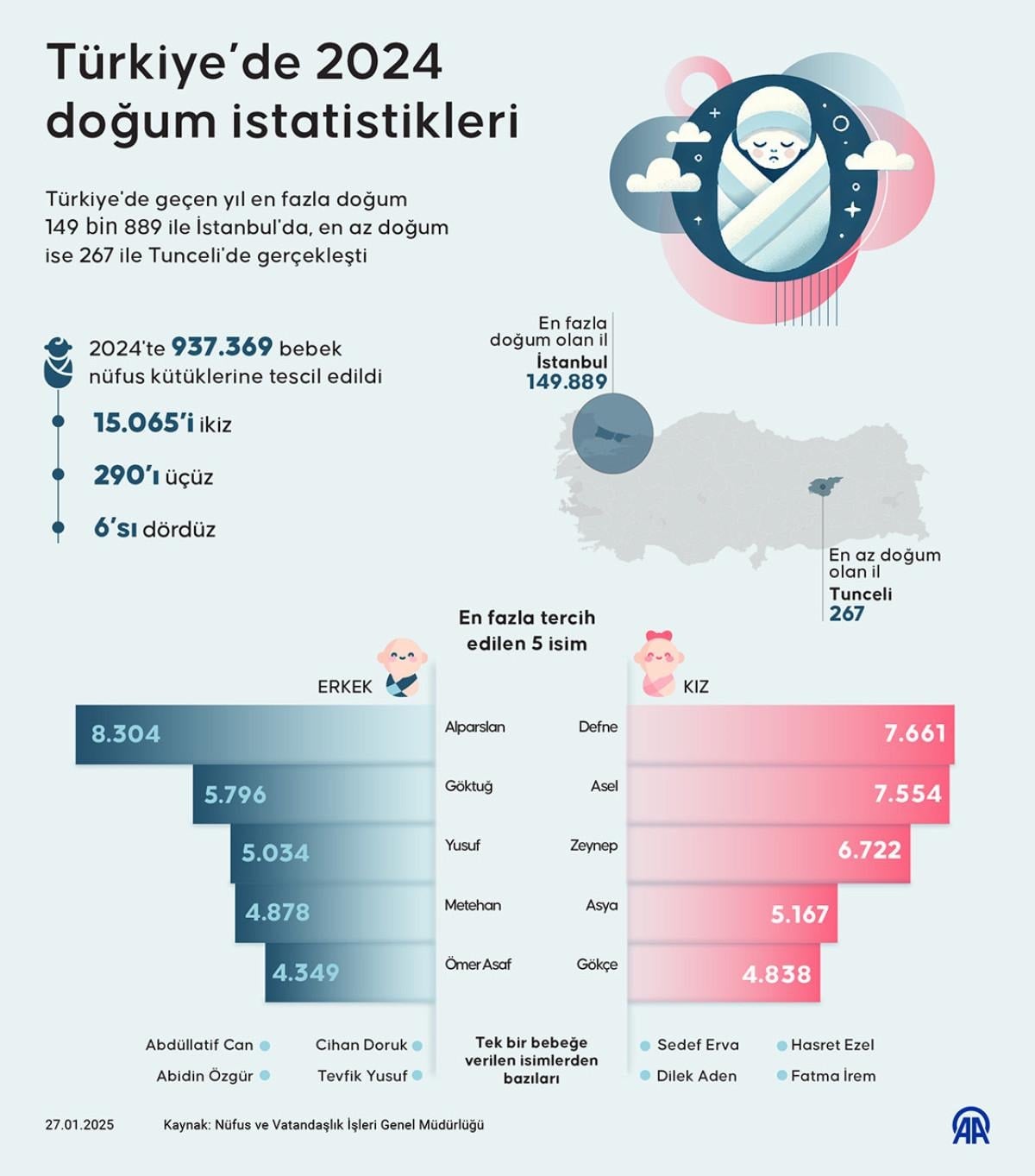 Türkiye'de 2024'te 937 bin 369 bebek nüfus kütüklerine tescil edildi; 15 bin 65 ikiz, 290 üçüz ve 6 dördüz doğum gerçekleşti.