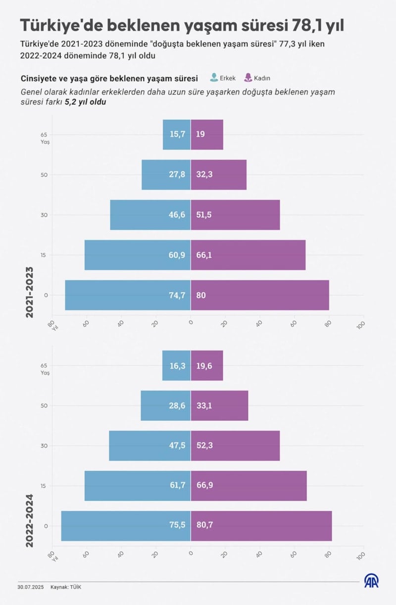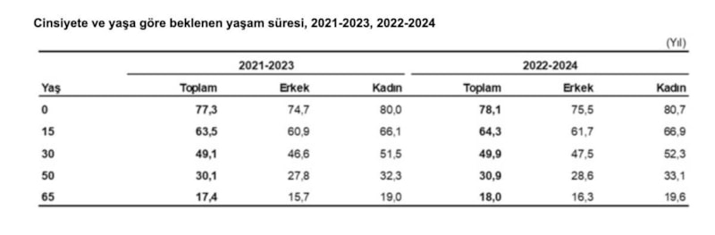 Türkiye İstatistik Kurulu (TÜİK) verilerine göre, yeni doğmuş bir bireyin mevcut ölümlülük risklerine maruz kalması durumunda yaşaması beklenen ortalama yıl sayısı olarak tanımlanan "doğuşta beklenen yaşam süresi" Türkiye'de 2021-2023 döneminde 77,3 yıl iken 2022-2024 döneminde 78,1 yıl oldu.
