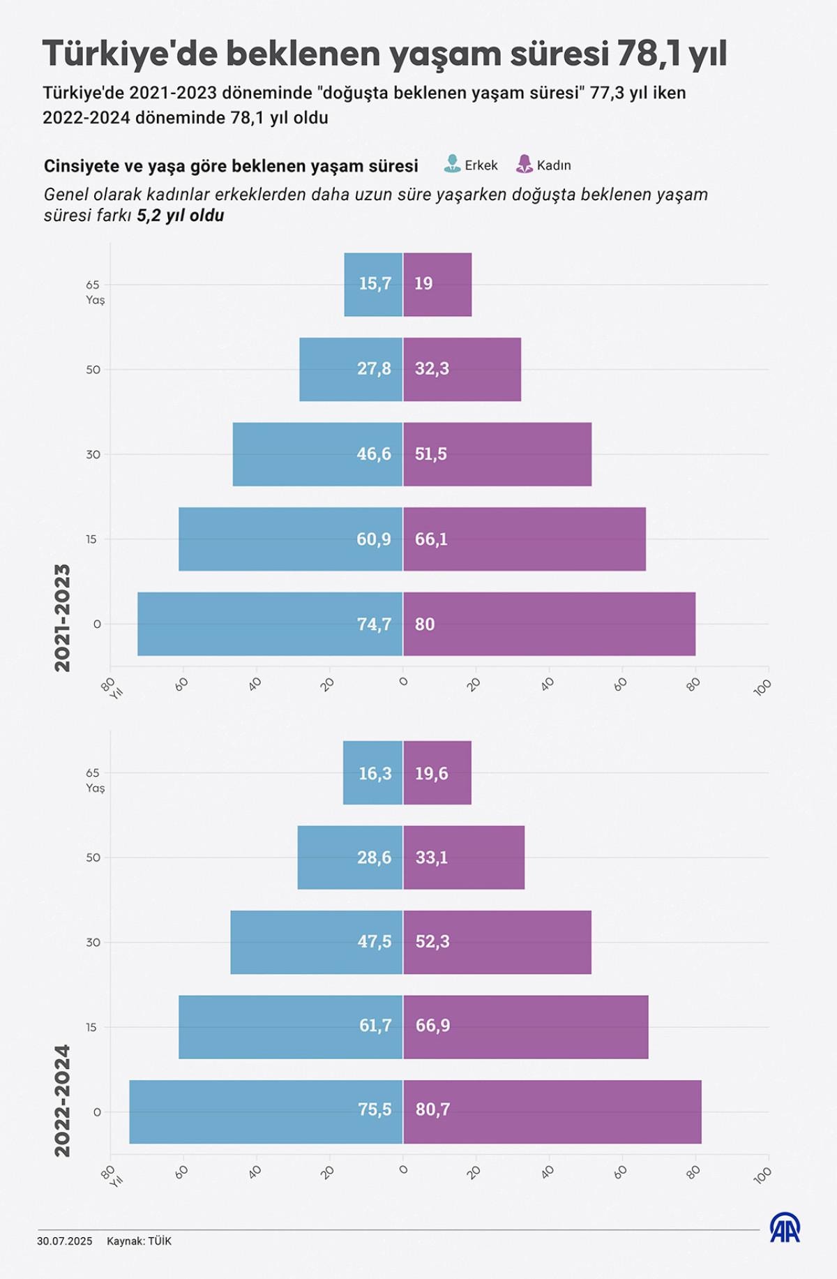 Türkiye'de 2021-2023 döneminde erkeklerde 74,7 yıl olan doğuşta beklenen yaşam süresi, 2022-2024 döneminde 75,5 yıl, kadınlarda ise 80 yıl iken 80,7 yıl oldu.