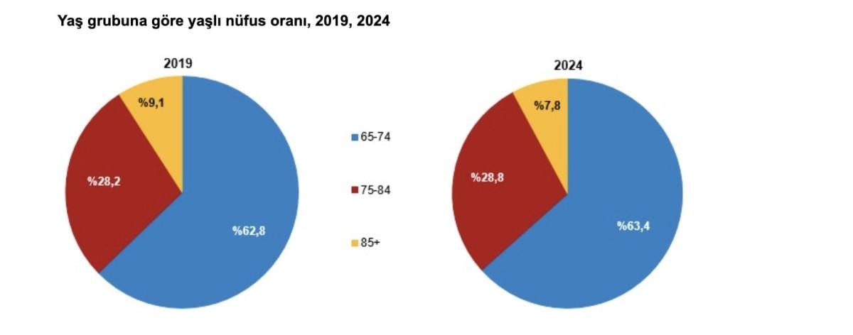 Yaşlı nüfusun toplam nüfus içindeki oranı ise 2019 yılında yüzde 9,1 iken, 2024 yılında yüzde 10,6'ya yükseldi. Yaşlı nüfusun 2024 yılında yüzde 44,6'sını erkek nüfus, yüzde 55,4'ünü kadın nüfus oluşturdu.