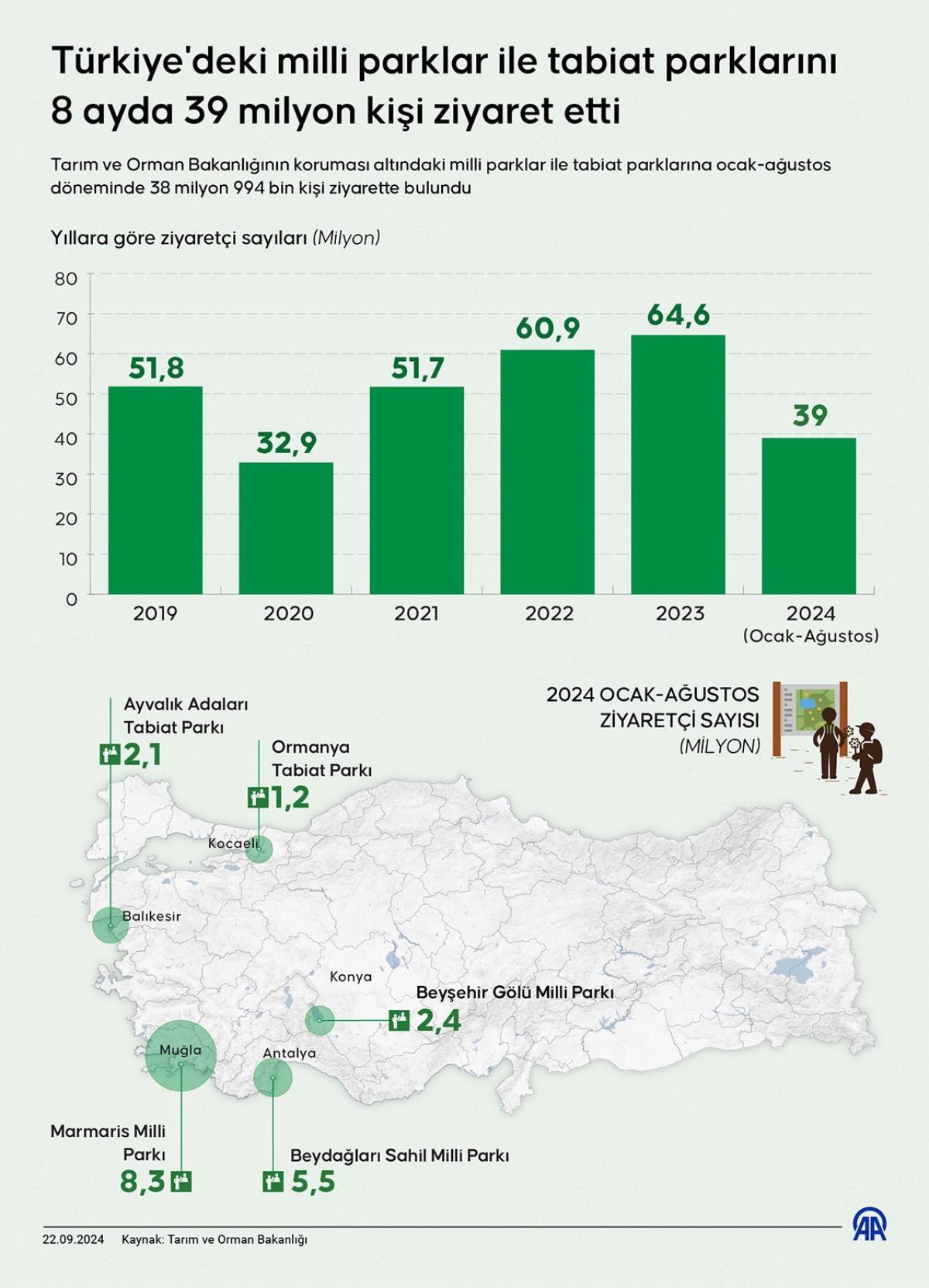 Tarım ve Orman Bakanlığı'nın koruması altındaki milli parklar ile tabiat parklarına ocak-ağustos döneminde 38 milyon 994 bin kişi ziyarette bulundu.