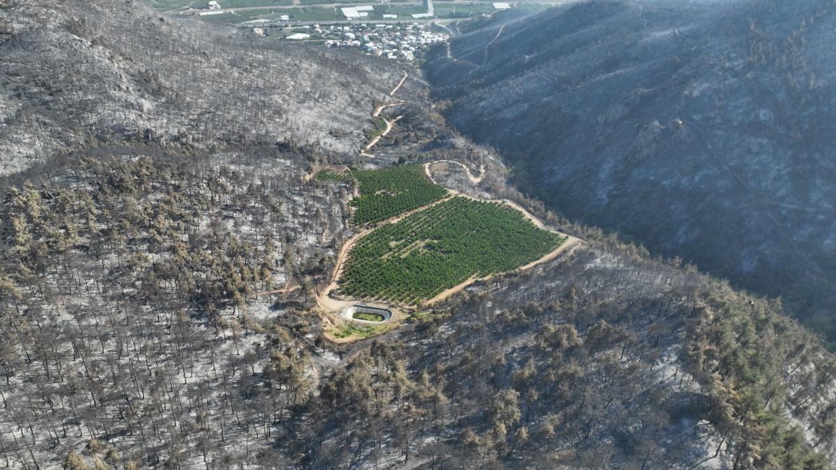 100 hektarlık ormanlık alandaki ağaçların hepsi küle dönerken, ormanın içinde Karahıdır Mahallesi'ndeki nektarın bahçesi, yemyeşil üzerinde meyveleriyle kala kaldı.