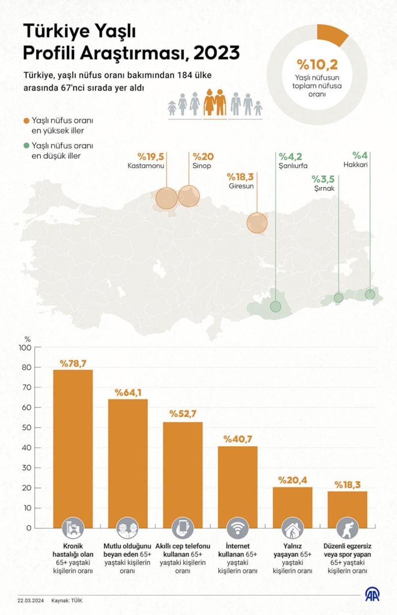Aile ve Sosyal Hizmetler Bakanlığı ile Türkiye İstatistik Kurumu (TÜİK) tarafından gerçekleştirilen "Türkiye Yaşlı Profili Araştırması 2023" kamuoyuyla paylaşıldı.