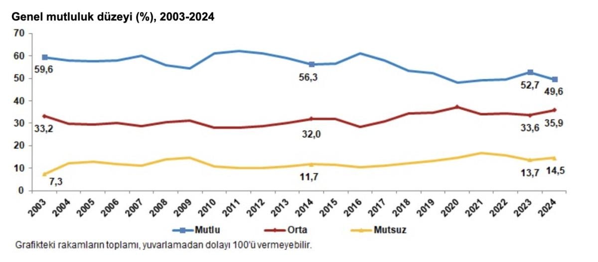 Yaşam Memnuniyeti Araştırması sonuçlarına göre, mutlu olduğunu beyan eden 18 ve üzeri yaştaki bireylerin oranı, 2023 yılında yüzde 52,7 iken 2024 yılında 3,1 puan azalarak yüzde 49,6 oldu.