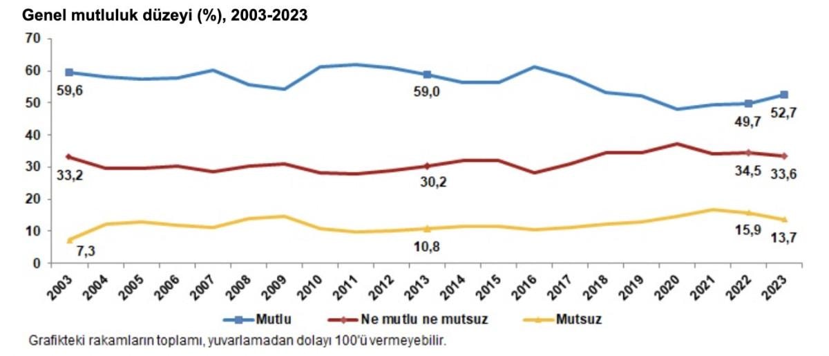 Buna göre, yaşam memnuniyeti araştırması sonuçlarına göre, mutlu olduğunu beyan eden 18 ve üzeri yaştaki bireylerin oranı, 2022 yılında yüzde 49,7 iken 2023 yılında 3,0 puan artarak yüzde 52,7 oldu.