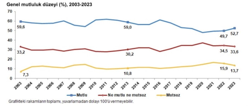 Geçen yıla ait kritik bir istatistik paylaşıma sunuldu. Türkiye'de 2022 yılında hayatından memnun olanların sayısı yüzde 49,7 iken 2023 yılında 3,0 puan artarak yüzde 52,7 oldu.