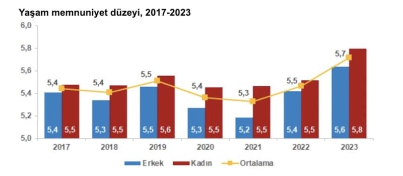 Bireylerin hayatlarını bir bütün olarak düşündüklerinde hissettikleri yaşam memnuniyet düzeyini hesaplamak amacı ile; hiç memnun olmayanlar için "0", çok memnun olanlar için "10" arasında bir değer alınarak ortalama hesaplandı. Bireylerin ortalama yaşam memnuniyet düzeyi 2022 yılında 5,5 hesaplanırken 2023 yılında 0,2 puan artış ile 5,7 oldu. Erkeklerde ortalama yaşam memnuniyet düzeyi 2023 yılında 5,6, kadınlarda ise 5,8 oldu.