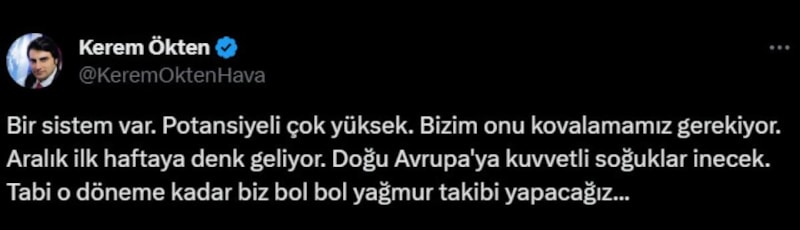 Meteoroloji Uzmanı Kerem Ökten, sosyal medya hesabından yaptığı paylaşımda takibe devam edeceklerini söyledi.