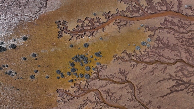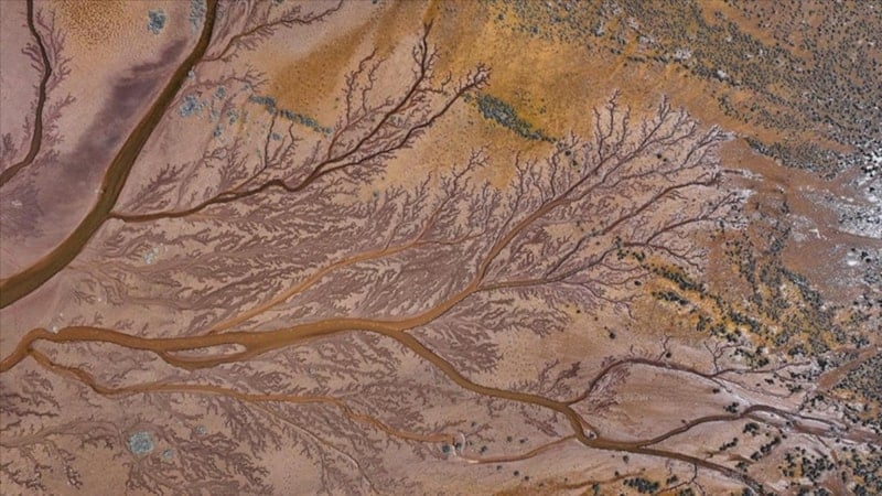 Göl çevresinde oluşan bu akış izleri, yukarıdan bakıldığında dallar halinde yayılan bir ağacı andıran şekiller ortaya çıkardı.