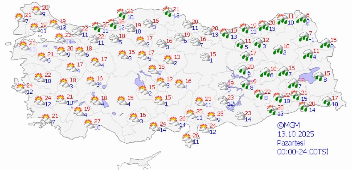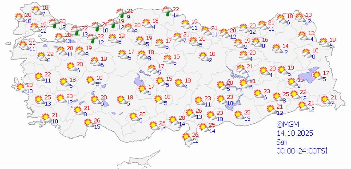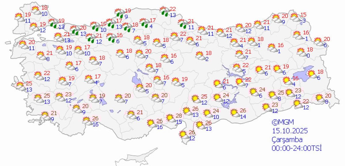 Meteoroloji Genel Müdürlüğü tarafından yapılan son tahminlere göre, Marmara, Batı Karadeniz, Doğu Karadeniz kıyıları ile Eskişehir ve Ordu çevrelerinin yağmur ve sağanak yağışlı, diğer yerlerin az bulutlu ve açık geçeceği tahmin ediliyor.