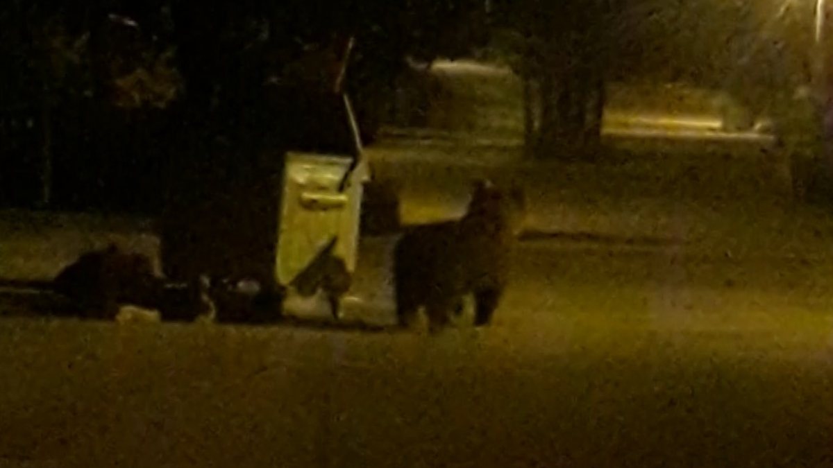Uludağ Sarıalan bölgesinde aç kalan anne ayı ve iki yavrusu karanlıkta kalan çöp konteynerinin yanında bir süre arandıktan sonra çöp konteynirini sokak lambasının altına taşıdı.