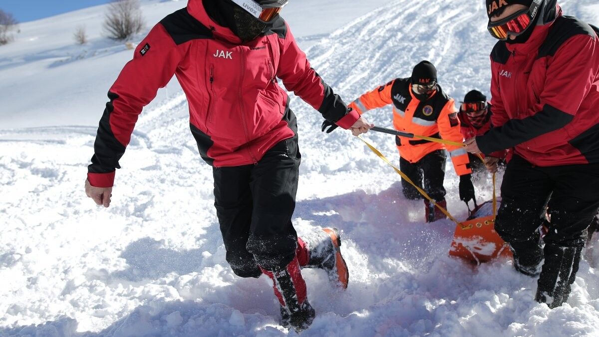 Çığ altında kalan bir kişinin olduğu ihbarını alan ekipler, kar motorları ile olay yerine kısa sürede ulaşarak bölgeyi bayraklarla çember altına aldı.