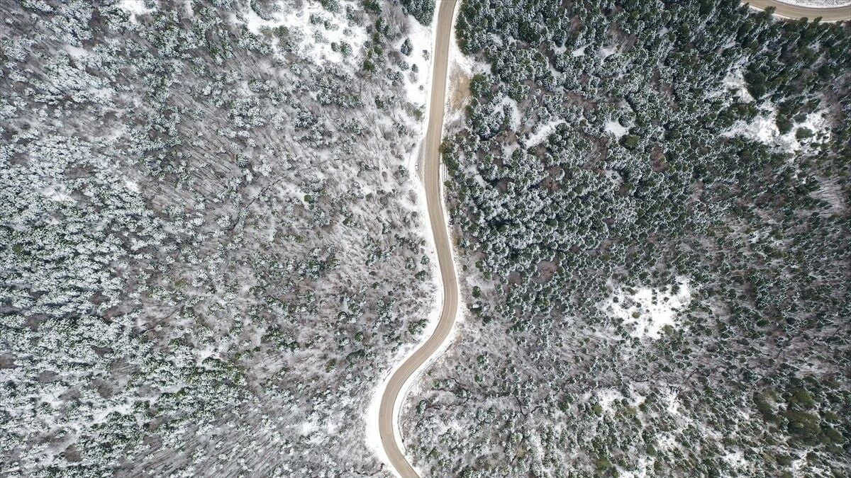 Yeşil ve beyazlarla kaplı yol drone'la görüntülendi.