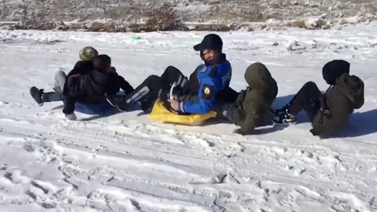 Ellerine aldıkları poşetlerle yokuştan kayan çocukları gören polis ekipleri de çocukların eğlencesine ortak oldu.