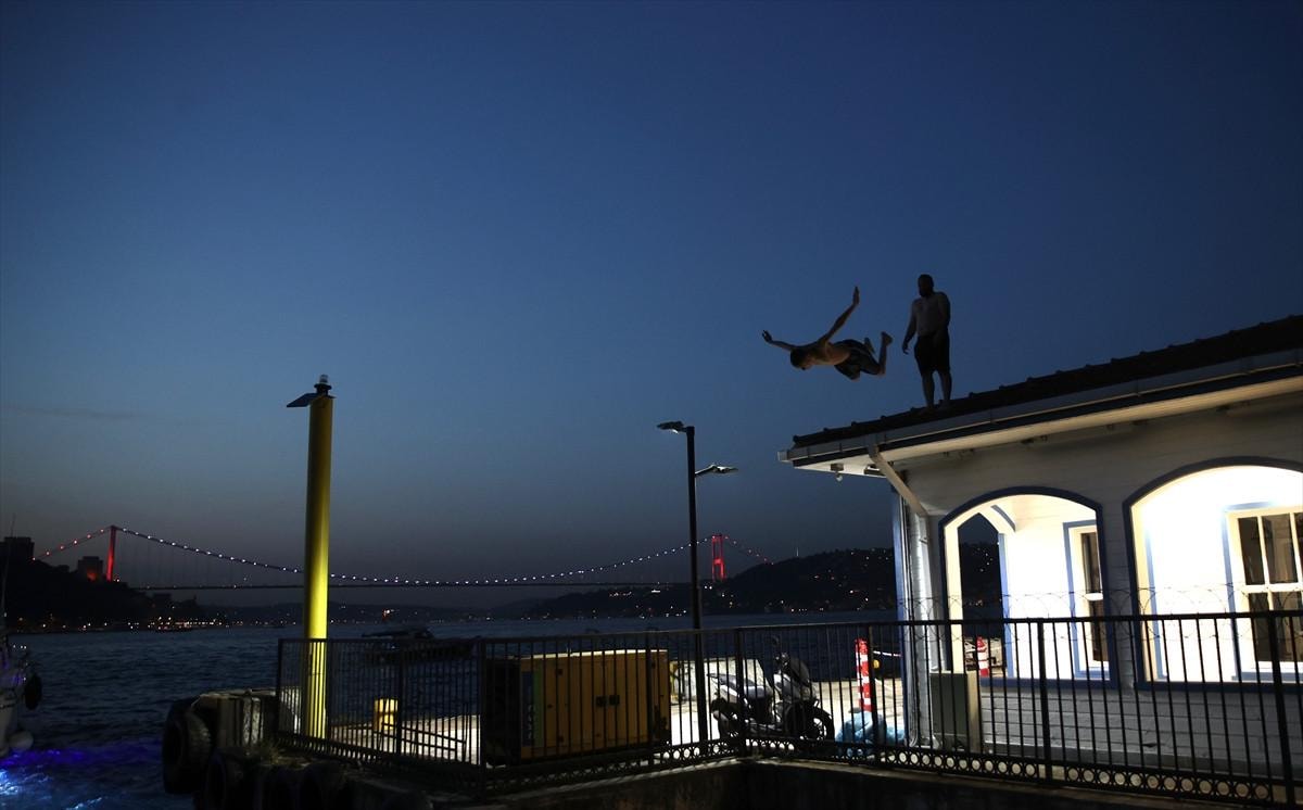 Üsküdar’daki Kandilli İskelesi’nden denize atlayarak serinlemeye çalıştı.