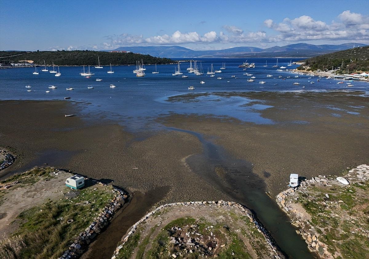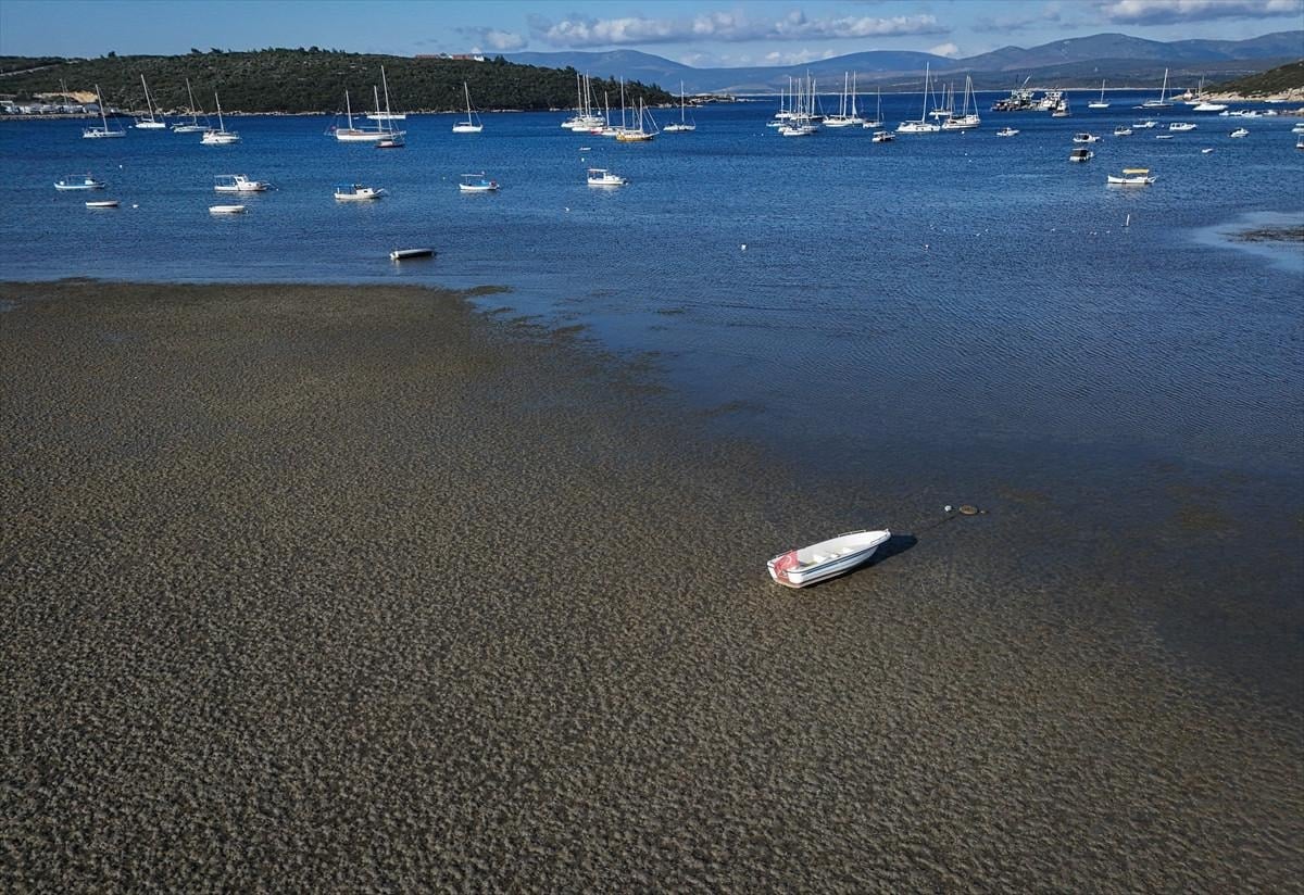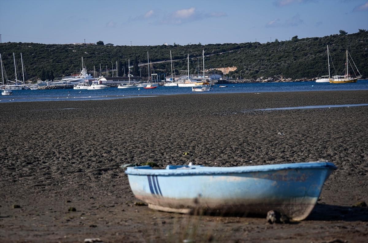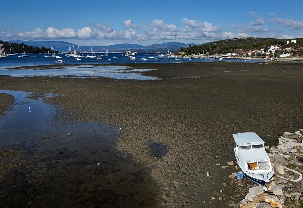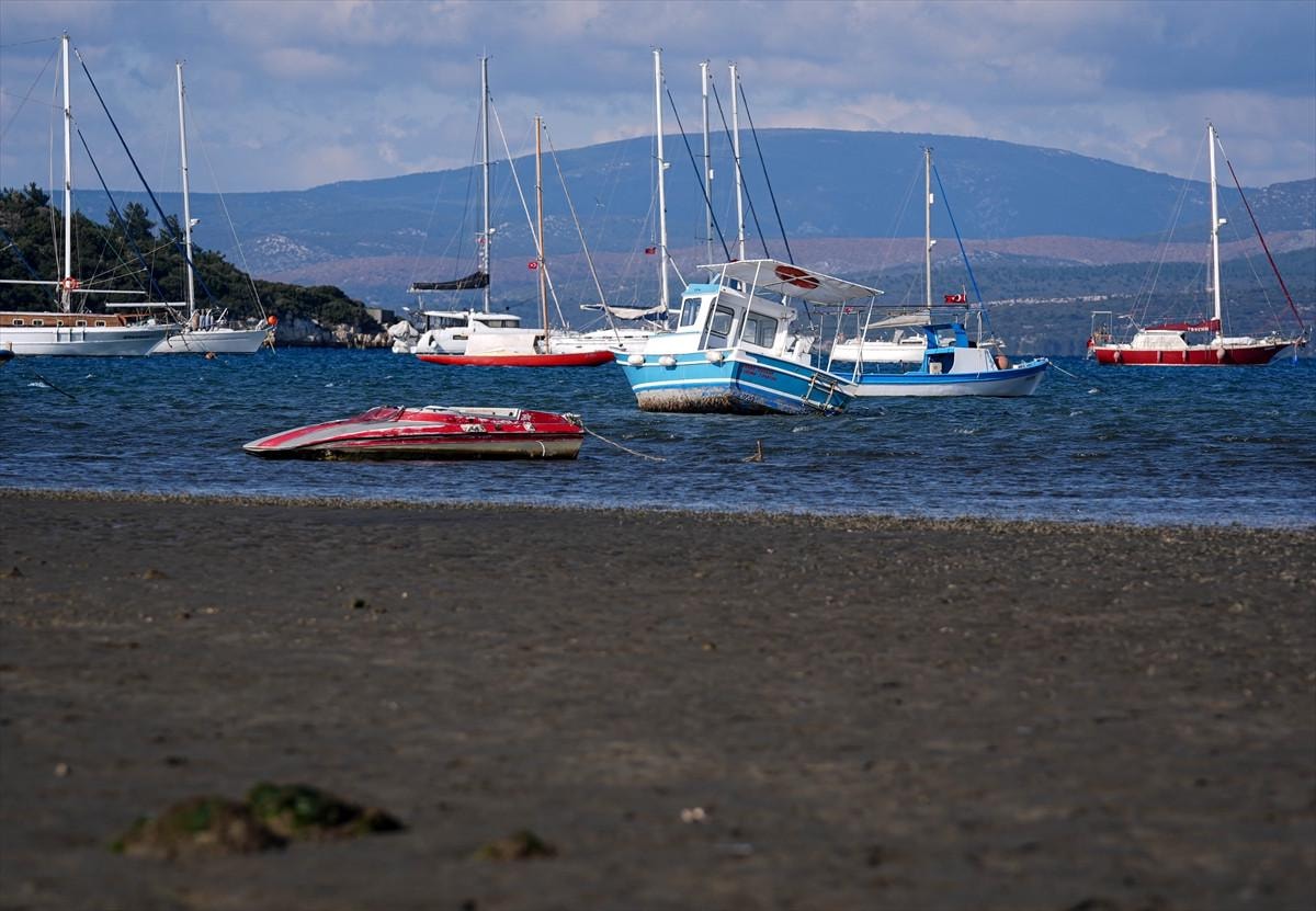 İzmir'in Seferihisar ilçesi Sığacık Mahallesi'nde deniz çekildi, tekneler karaya oturdu.