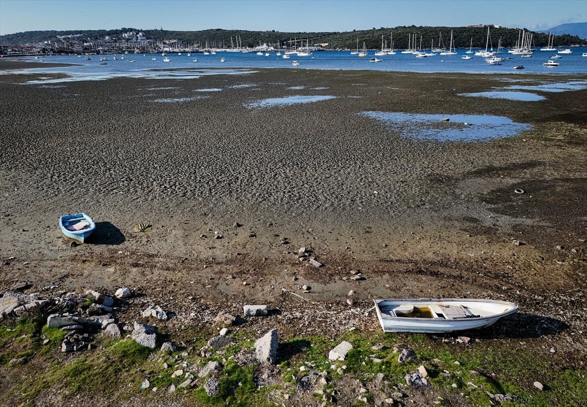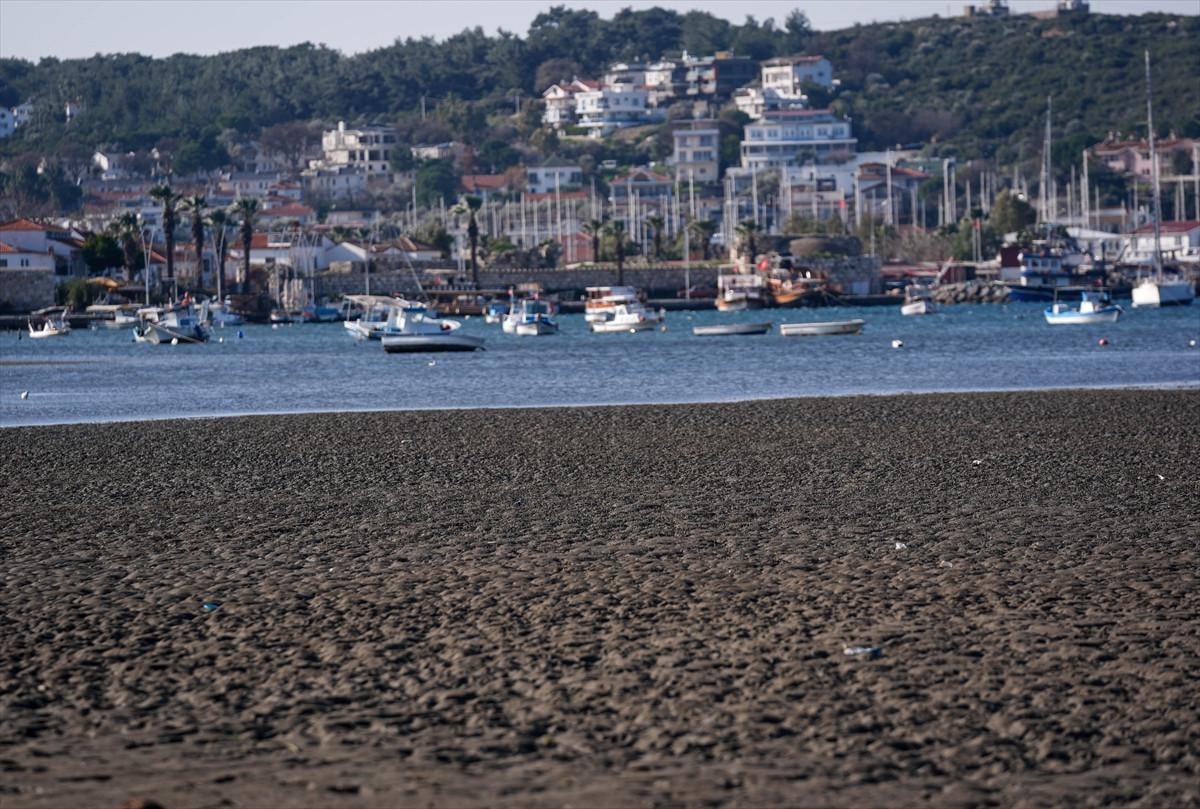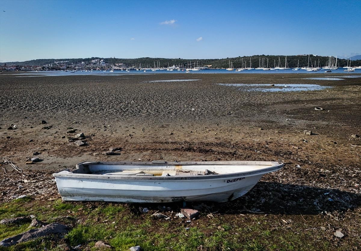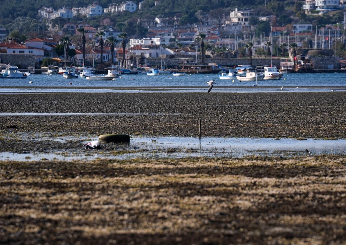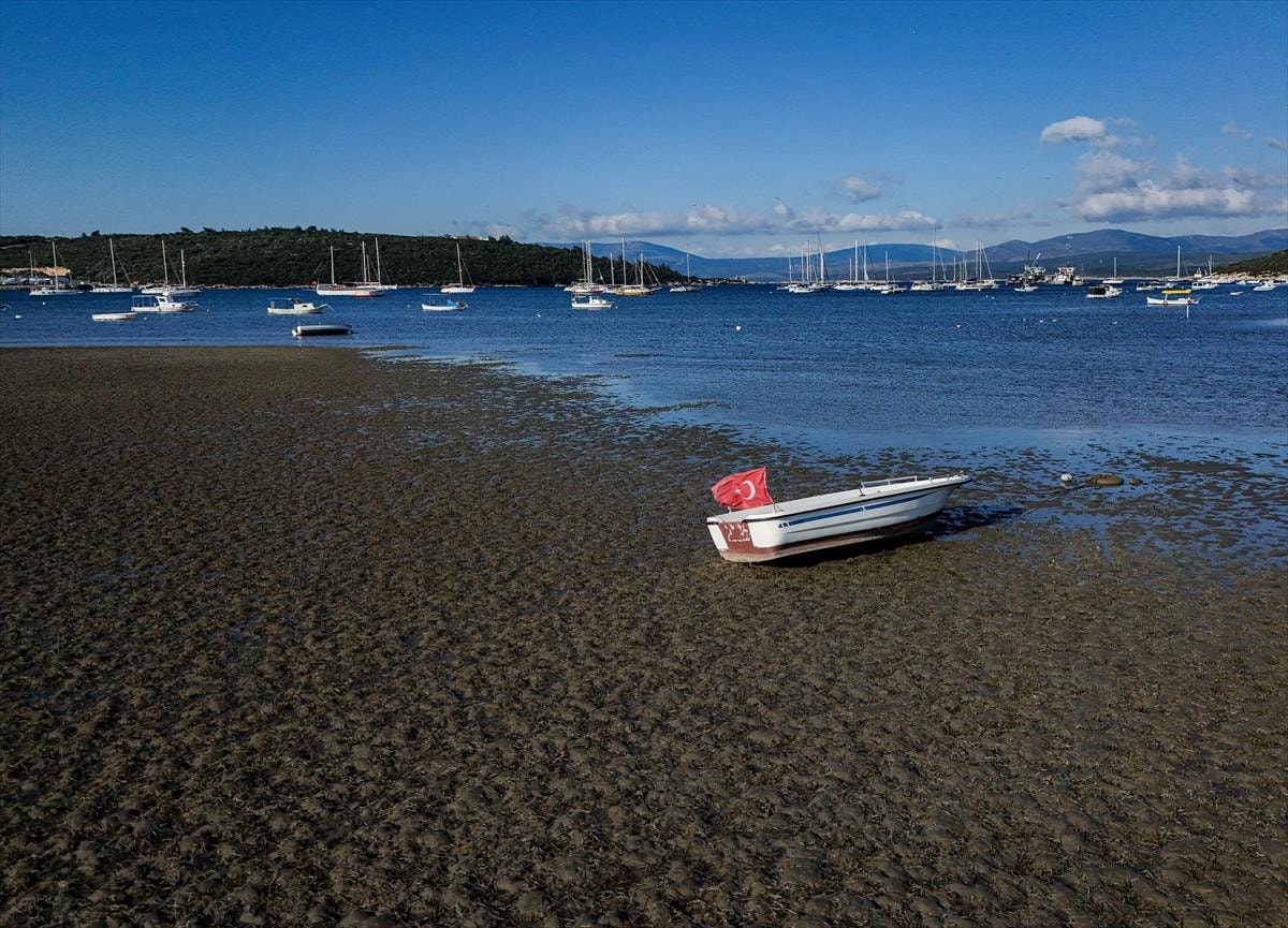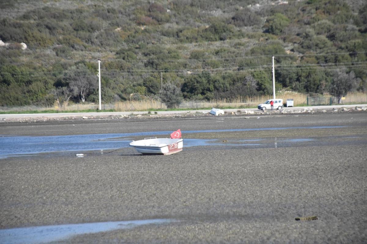 İzmir'in Seferihisar ilçesi Sığacık Mahallesi'nde deniz çekildi, tekneler karaya oturdu.