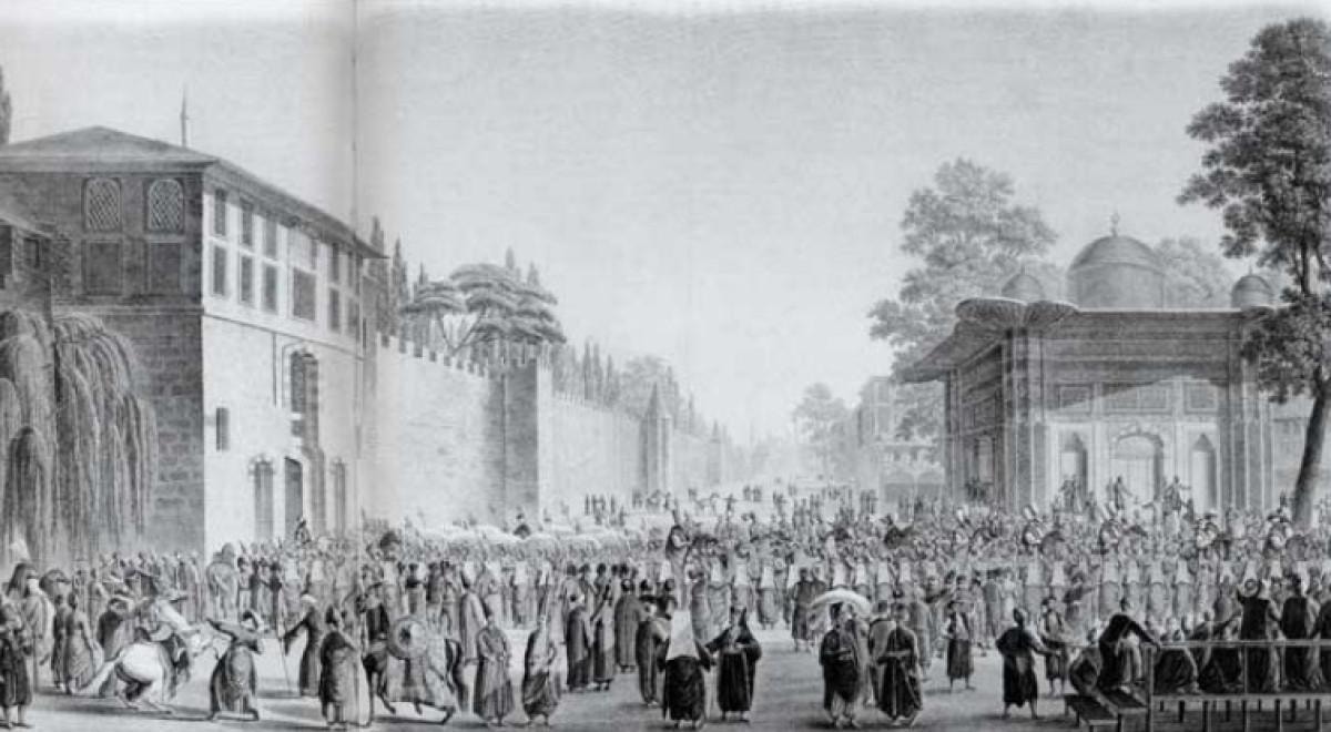 “Osmanlılarda bayram adı verilen yortular yılda iki kez kutlanır. Birincisine Büyük Bayram, ikincisine Küçük Bayram derler. İkincisi, birincisinden iki ay sonra kutlanır. İnsanlar sokakta birbirlerine rastladıklarında ‘bayramlık’ diye selam verirler. Yeniçeri ve Acemioğlanlar, ellerinde berber dükkânlarında kullanılan gül suyu dolu cam şişelerle sokakları dolaşır ve gelene geçene bundan püskürtürler. Bazıları da gül suyu yerine güzel kokulu bir çiçek sunar.”