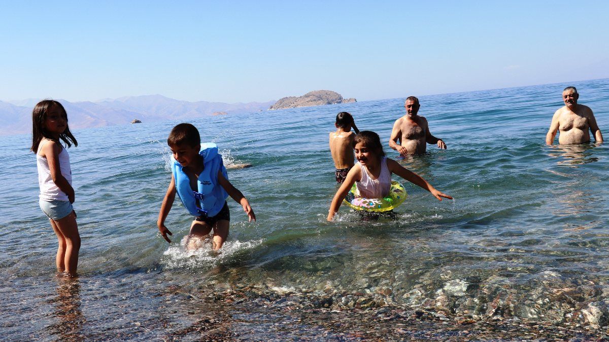 Van Gölü’nün kıyı kesimlerinde vatandaşlar çocuklarıyla birlikte yüzmenin tadını doyasıya çıkarıyor.