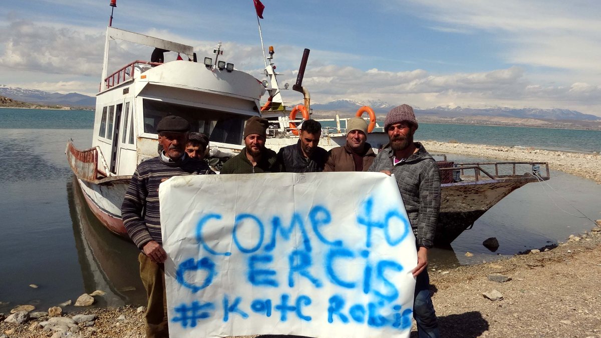 Başlayan balık yasağı nedeniyle dün son kez ağlarını çeken balıkçılar, üzerine İngilizce 'Come to Erciş #Kate Robins' yazılı pankart açarak ABD'li Astronot Rubins'i ilçeye davet etti.