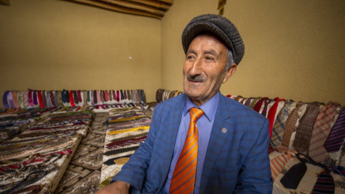 Hayvanlarını otlatırken, ev işlerini yaparken takım elbise ve kravatını çıkarmayan Akbulut, evinin en büyük odasında rengarenk kravatlarının bir kısmını sergiliyor.