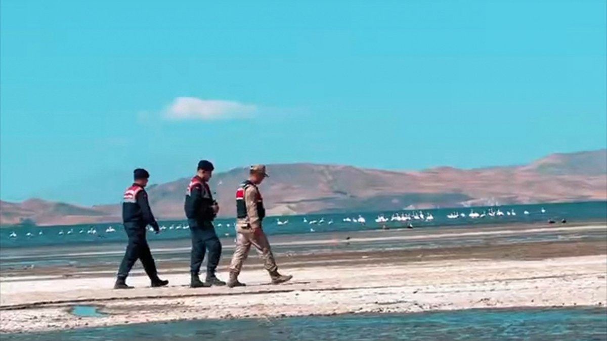 Van'da jandarma ekipleri, "kuş cenneti" olarak bilinen Erçek Gölü'nde konaklayan flamingoları korumak için çalışma yürüttü.