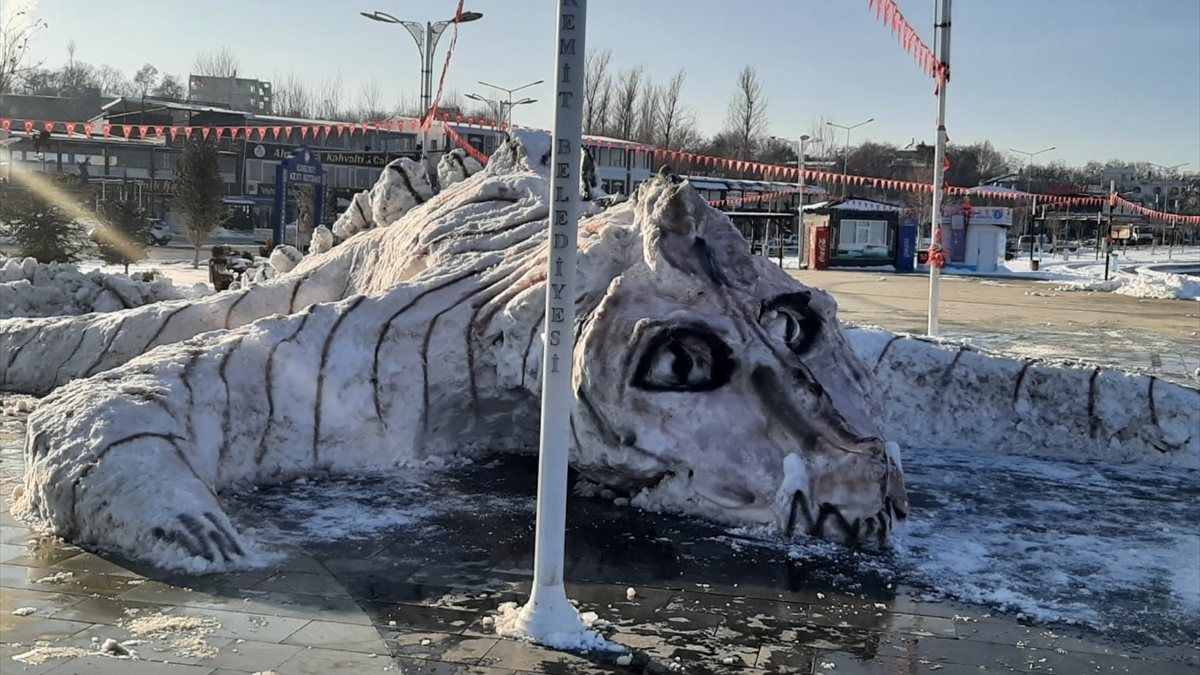 Edremit ilçesindeki Kent Meydanı'nda biriken karları temizleyen işçiler, 10 metre uzunluğunda dev "Van Gölü canavarı" yaptı.