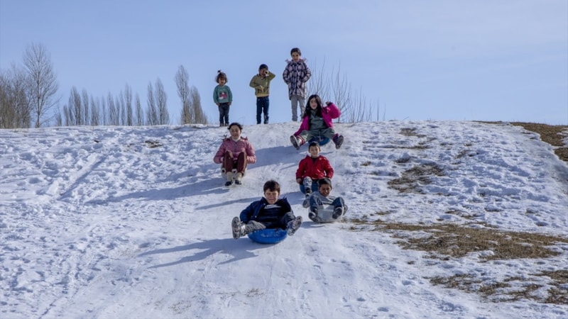 Van'ın Erciş ilçesine bağlı İkizçalı Mahallesi’nde yaşayan çocuklar, kar yağışının keyfini plastik bidonlarla kayarak çıkardı. Tepelik bir alanda toplanan çocuklar, bidonlarını kızağa dönüştürerek doyasıya eğlendi.