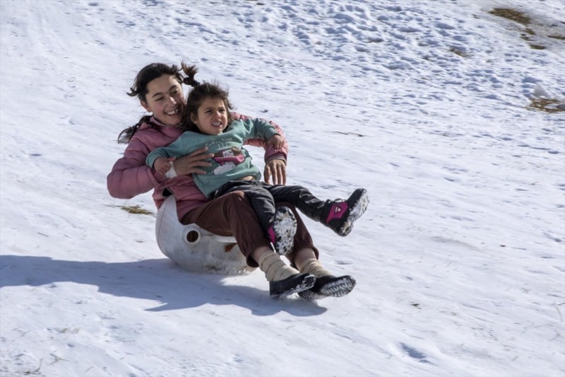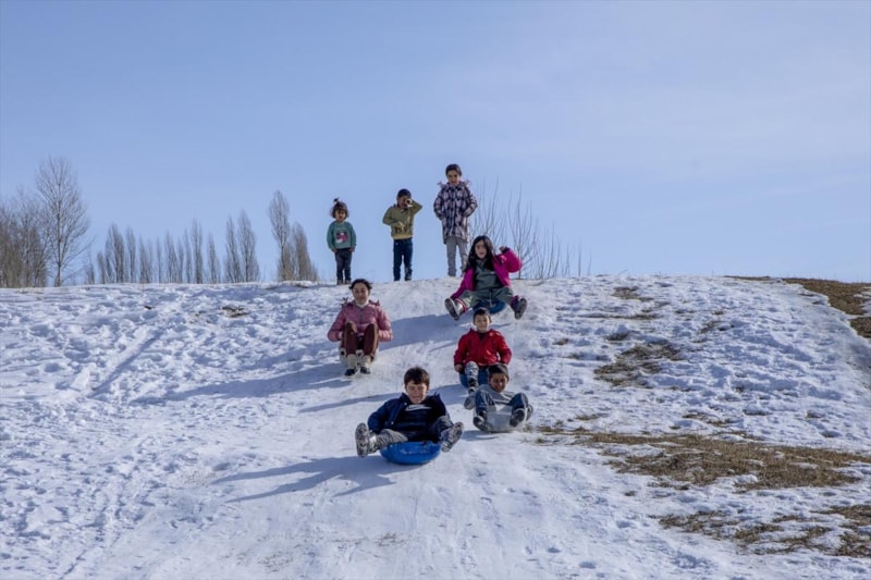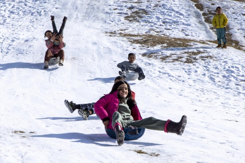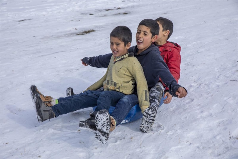 Zaman zaman düşüp kalkarak, birbirlerine destek olup birlikte kaymaya çalışan çocukların renkli anları, çevredekilere neşe kaynağı oldu. Bu keyifli görüntüler, karın beyaz örtüsü üzerinde adeta çocukluğun masumiyetini yansıttı.