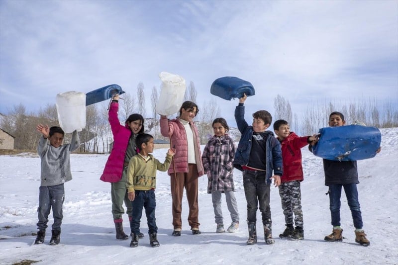 Evden getirdiğimiz plastik bidonlarla kayıyoruz. Arkadaşlarımla çok güzel vakit geçiriyoruz. En zor kısmı, kaydıktan sonra bidonlarla tekrar tepeye tırmanmak. Ama aşağı kayarken her şeyi unutuyoruz, çok eğleniyoruz.