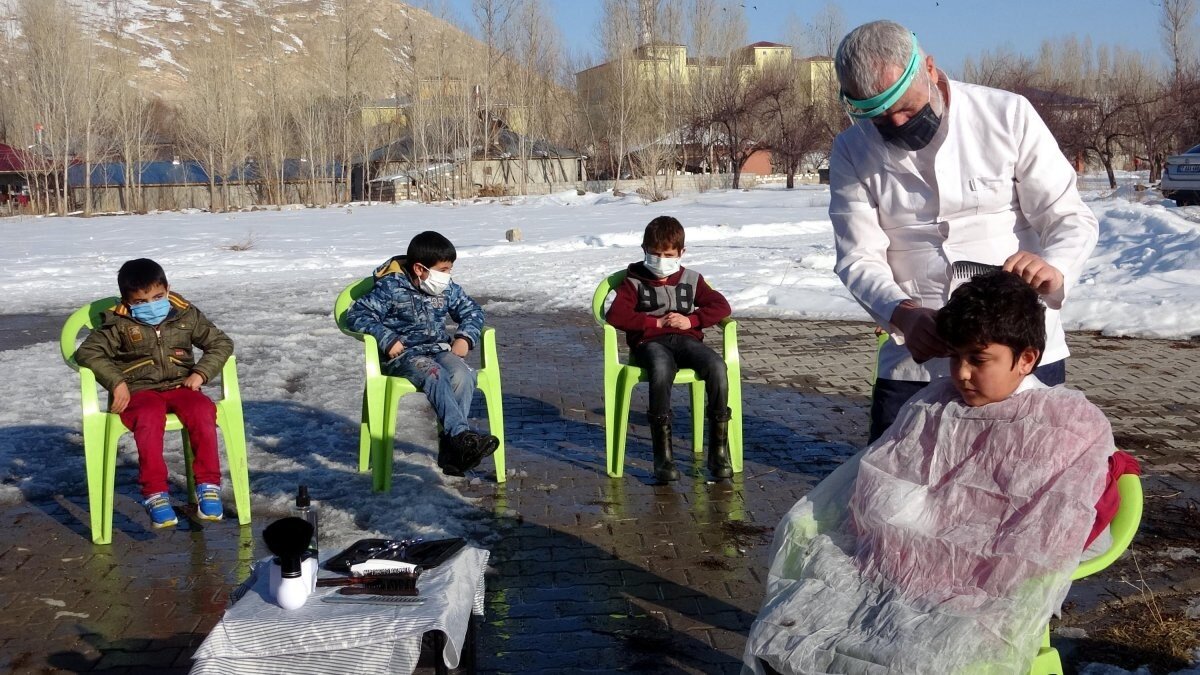 İlçe merkezinde getirdiği kuaförle ev ev dolaşıp, çocukları ücretsiz tıraş ettiren Doğu, çocuklara çeşitli kırtasiye malzemesi de hediye etti.
