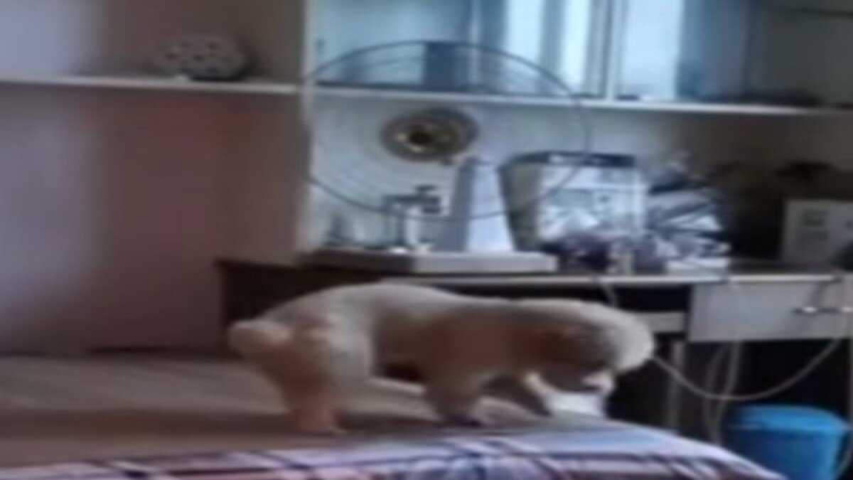 Önce yatacağı yeri hazırlayan köpek daha sonra masa üzerinde bulunan vantilatörü çalıştırıp, ardından odanın lambasını kapattı.