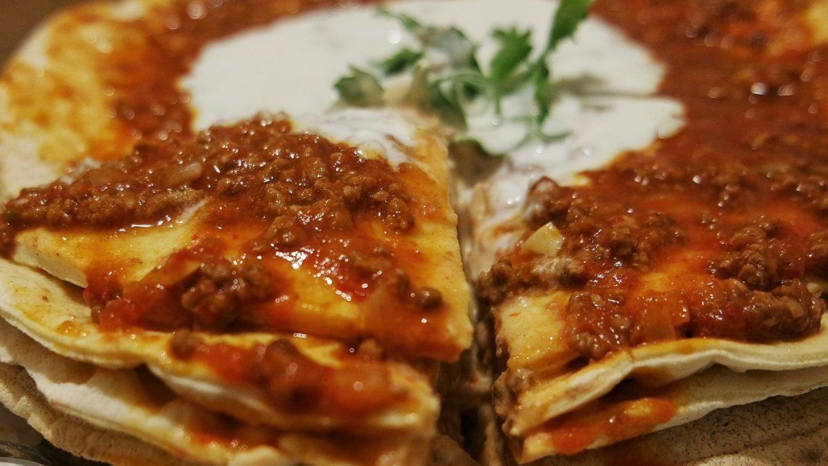 Soğanı doğrayın, sıvı yağda kavurun. Kıymayı ekleyin kavurmaya devam edin. Kırmızı ve yeşil biberleri, biber ve domates salçasını, domates sosunu , karabiber, pul biber, toz biber , su ekleyip kavurmaya devam edin, en son maydanoz koyun. Yufkaları sacda yada tavada pişirin.