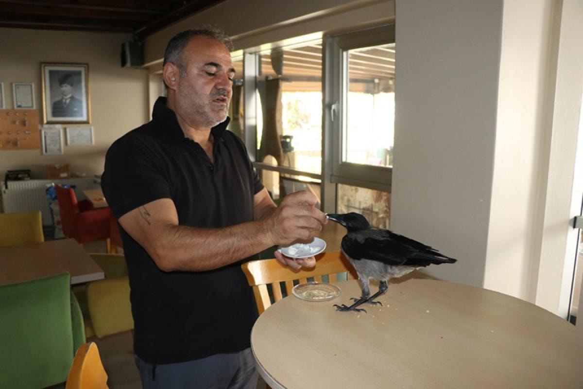 Kedi ve köpeğiyle birlikte pansiyonun kafe bölümünde büyüttüğü kargaya “Siyah” adını veren Boyraz, kısa sürede onunla güçlü bir bağ kurdu.