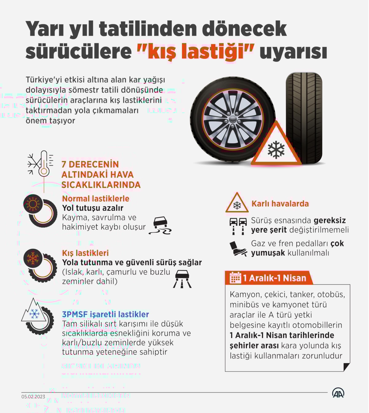Öte yandan; Kamyon, çekici, tanker, otobüs, minibüs ve kamyonet türü araçlar ile A türü yetki belgesine kayıtlı otomobillerin 1 Aralık-1Nisan tarihlerinde şehirler arası yollarda kış lastiği kullanmaları zorunludur.