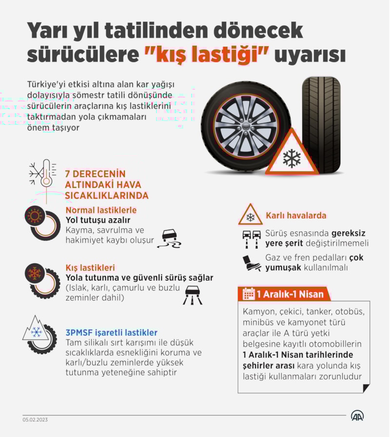Türkiye'yi etkisi altına alan kar yağışı dolayısıyla sömestr tatili dönüşünde sürücülerin araçlarına kış lastiklerini taktırmadan yola çıkmamaları önem taşıyor.