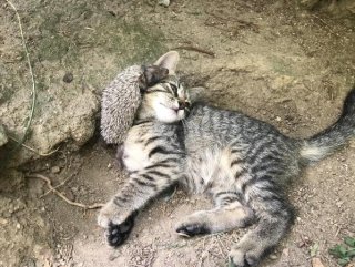 ANNE KEDİ, KİRPİ YAVRULARINI DA KORUYOR