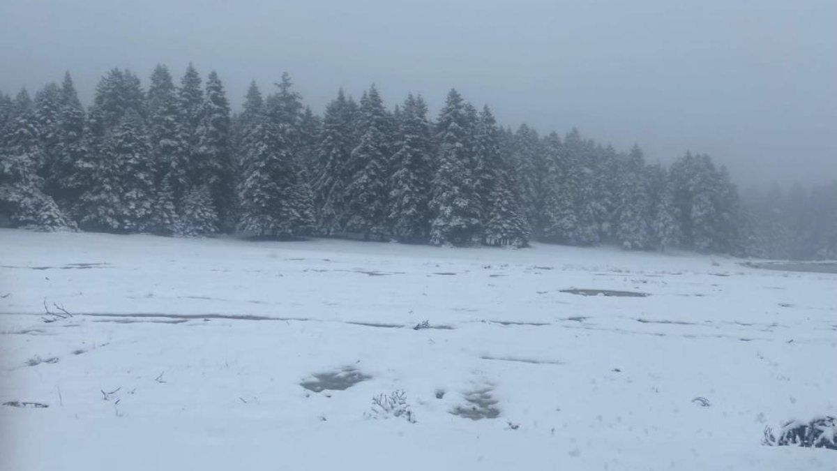 Hava sıcaklığının 5 derece ölçüldüğü bölgede, gece saatlerinde etkili olan yağış Yedigöller Milli Parkı'nın yüksek kesimlerini beyaz örtüyle kapladı.