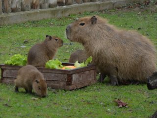 Annelerinin yanından bir an bile ayrılmayan kapibaralar marul, ot, çimen ve fundalık ile besleniyor.