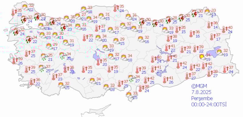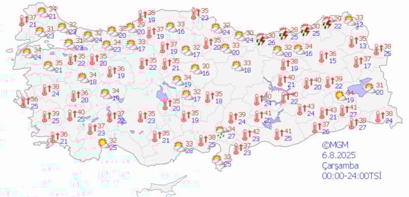Yurt genelinde günün en yüksek sıcaklığı, 44,7 dereceyle Şırnak Cizre'de ölçüldü. Bunu Siirt'in Kurtalan ilçesi 42,3, Diyarbakır'ın Bağlar ilçesi ise 42,2 dereceyle takip etti.