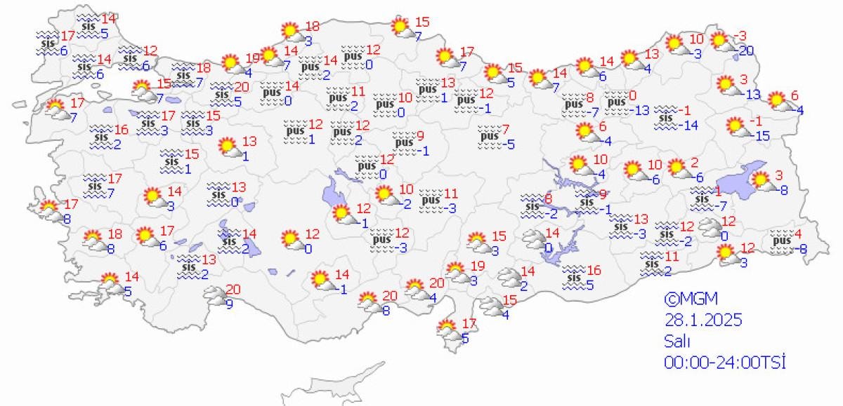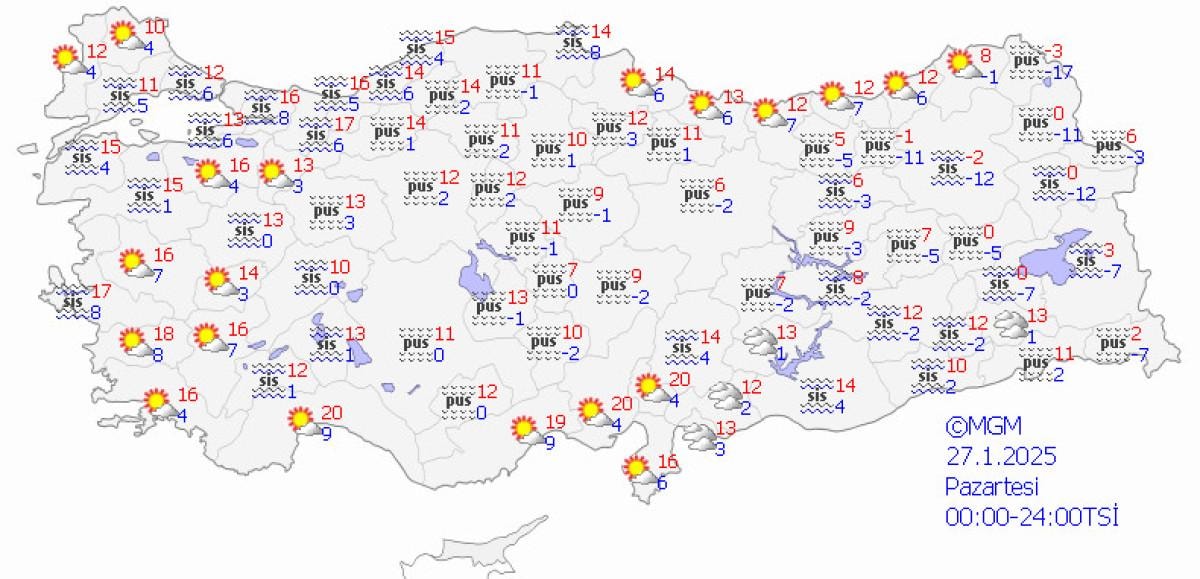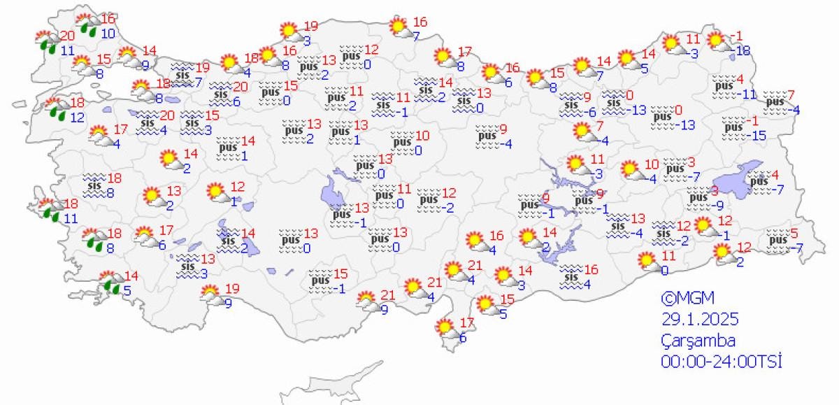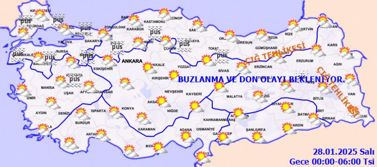 Meteoroloji Genel Müdürlüğü'nden yapılan uyarıda, "Yurdun doğu kesimlerinin parçalı ve yer yer çok bulutlu diğer yerlerin parçalı ve az bulutlu geçeceği tahmin ediliyor. Yurdun iç ve doğu kesimlerinde buzlanma ve don ile birlikte pus ve yer yer sis görüleceği tahmin ediliyor. Doğu Karadeniz’in iç kesimlerinin yüksekleri ile Doğu Anadolu’nun yüksek ve dik yamaçlarında çığ tehlikesi bulunmaktadır." notu düşüldü.