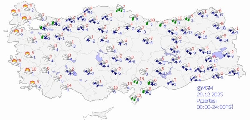 Rusya ve İzlanda üzerinden gelen soğuk hava dalgası, yeni haftada tüm yurdu donduracak. Bugün İstanbul'un bazı bölgeleri de dahil birçok kenti beyaz örtüyle kaplamaya hazırlanan kar yağışı, çarşamba günü ise 56 ile yayılacak.