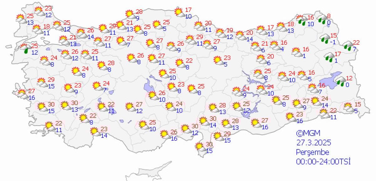 Meteoroloji Genel Müdürlüğü tarafından yapılan son tahminlere göre, ülkenin batı kesimlerinin parçalı ve çok bulutlu, Marmara’nın batısı, Bursa, Kütahya ve Manisa çevreleri ile İzmir'in kuzey kesimlerinin sağanak yağışlı, diğer yerlerin az bulutlu ve açık geçeceği tahmin ediliyor.