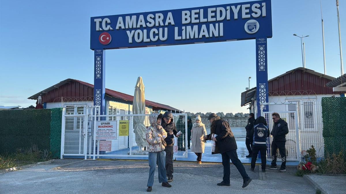 Amasra Limanı'na gelen gemideki Rus turistlere, liman çıkışında ilçeyi tanıtıcı broşürler dağıtıldı.
