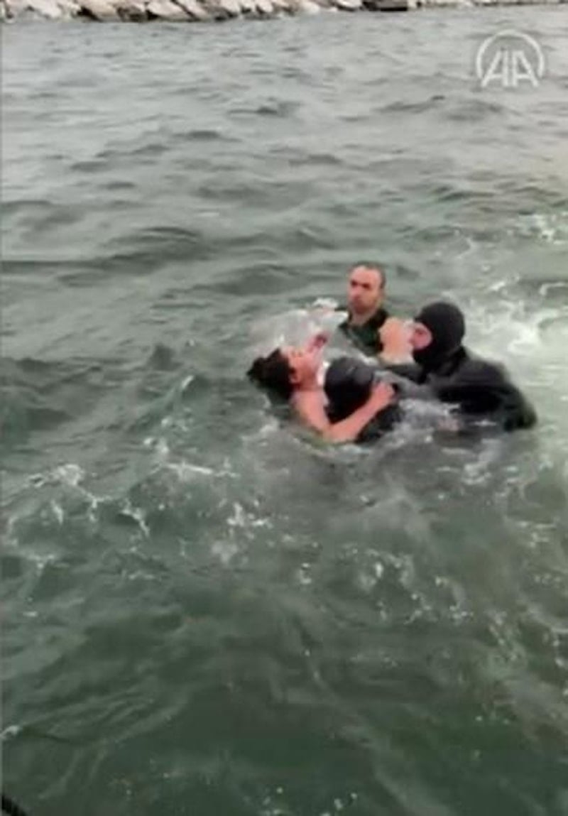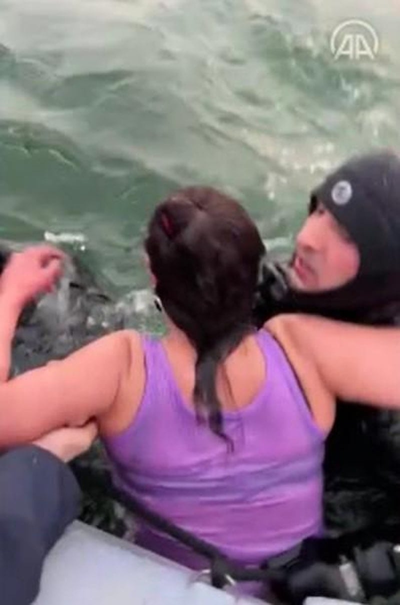 Soğuk suya ve dalgalara aldırış etmeden denize giren Fas uyruklu kadın, ekipler tarafından botla karaya çıkarıldı.