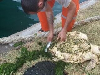 İskenderun Körfezi'nde kabuğu yosun bağlamış caretta caretta, balıkçılar tarafından fark edildi.