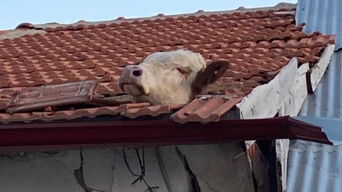 Çökmenin etkisiyle kafası kiremitlerin arasına sıkışan dana, ahırın çatısında asılı kaldı. Dana, sahipleri tarafından uzun uğraşlar sonucu kurtarıldı.